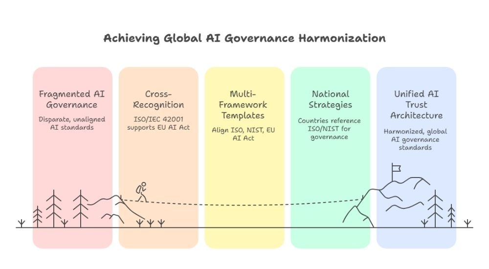 When ISO, NIST, and the EU AI Act are combined, they provide what many experts refer to as the “triad of trust,” a worldwide framework for creating AI that is secure, open, and compatible with the law.